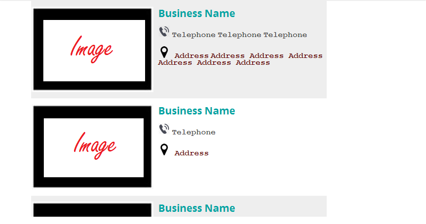 Image should be in Left side and remaining data should be in right side (Business name, Contact no and Address) should come below each other.